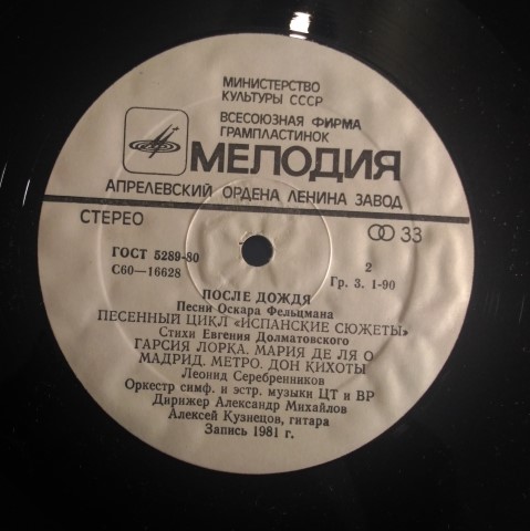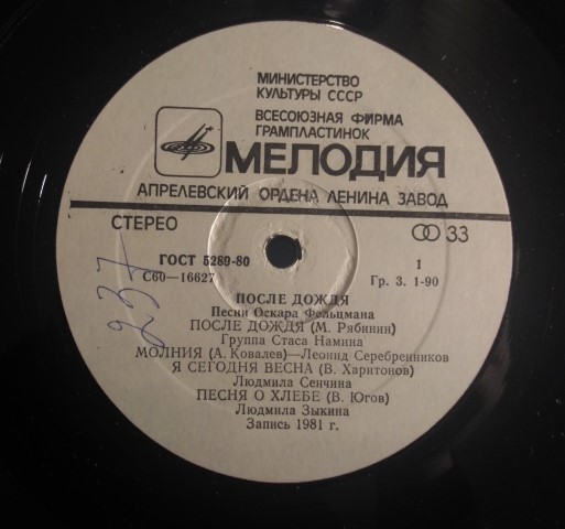 Альбом: После Дождя ; Изготовлено: USSR ; Релиз: 1982 ; Издание: ; Вин/Обл: VG+/VG+