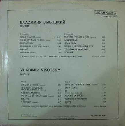 Альбом: Песни ; Изготовлено: USSR ; Релиз: 1981 ; Издание: ; Вин/Обл: VG+/VG+