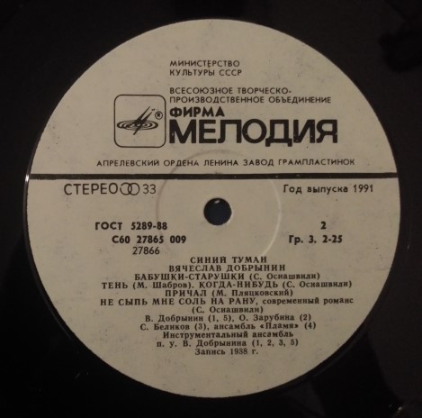 Альбом: Синий Туман ; Изготовлено: USSR ; Релиз: 1991 ; Издание: ; Вин/Обл: VG+/VG+