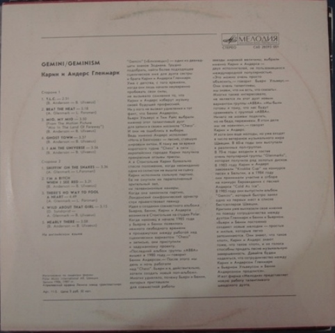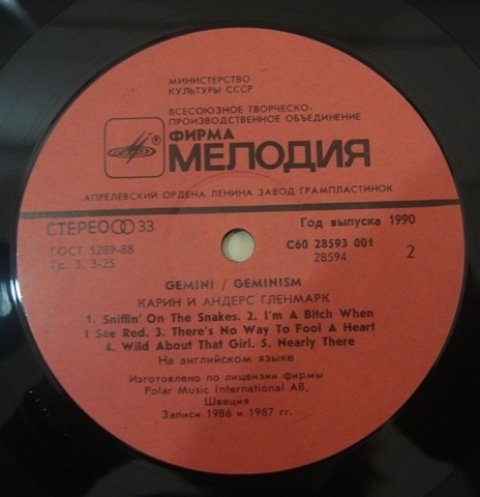 Альбом: Geminism ; Изготовлено: USSR ; Релиз: 1990 ; Издание: ; Вин/Обл: VG+/VG